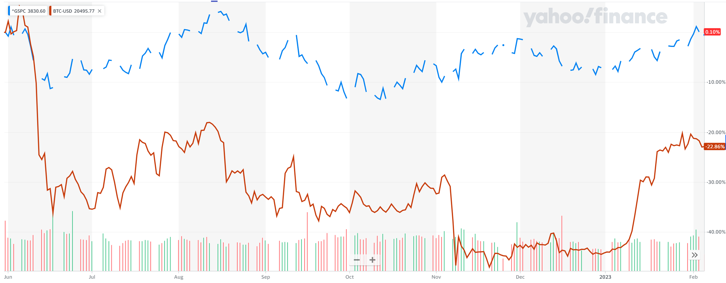As of January 31, 2023, the YTD of bitcoin is up approximately 39%, while the S&P 500 and Nasdaq Composite are up 5.9% and up 10.8% respectively.