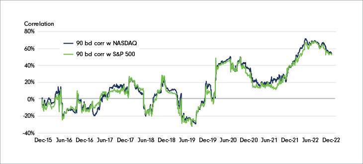 “We expect them to not be as highly correlated going forward,” Ben McMillan, CIO of IDX Digital Assets said. “But I do think a positive correlation between bitcoin and risk assets, in particular things like technology stocks, is here to stay.”